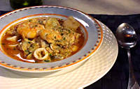 Cozinhe até que os vongoles se abram, acrescente ao caldeirão o purê de tomates e a água da casca dos camarões, cozinhe por 20 minutos. Tempere os camarões, lulas e peixe com sal e pimenta do reino e coloque no caldeirão os pedaços de peixe, cozinhe por 5 minutos e coloque os camarões, cozinhe por mais 3 minutos e acrescente as lulas, cozinhe por 1 minuto e acrescente o siri, cozinhe por mais 5 minutos.