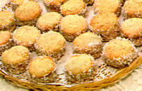 Bata a margarina, o açúcar e as gemas. Junte os outros ingredientes e sove até homogeneizar. Abra a massa na espessura de 1,5 cm. Corte em rodelas e asse em forno médio por 15 min. Junte duas rodelas, recheando com doce de leite. Passe a lateral no coco ralado.
