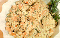 Prepare o brodo, misturando todos os ingredientes em 1 litro de água e deixando ferver por 30 min. Coe no final. Auqeça a metade da manteiga e refogue a cebola e o alho por 1 min. Acrescente o bacon, o presunto cru e o arroz e deixe refogar por 2 min. Adicione o vinho branco e deixe evaporar um pouco. Adicione o alecrim e o brodo, aos poucos, até que o arroz fique al dente. Misture o cogumelo, o restante da manteiga e o queijo ralado, deixando cozinhar por 2 min.