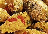A seguir, junte o arroz e frite por 2 minutos, ou até ficar levemente tostado. Junte 3 xícaras (chá) de água, o orégano, o sal e misture bem. Assim que a água ferver, reduza a chama, tampe a panela e cozinhe por mais 15 minutos, ou até o arroz ficar macio. Retire e deixe esfriar. Ligue o forno à temperatura média. Unte duas fôrmas de 33 x 23 cm com o azeite restante e polvilhe com farinha de trigo. Acrescente ao arroz os ovos e a farinha de trigo. Acerte o sal e misture bem. Com uma colher, faça 38 bolinhos e empane-os na farinha de rosca. Disponha os bolinhos nas fôrmas e leve ao forno por 30 minutos, ou até dourar.