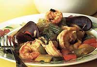 Coloque o azeite em uma panela e junte os pimentões, os tomates, o salsão e a pimenta. Leve ao fogo e refogue, mexendo de vez em quando, por 7 minutos, ou até os legumes ficarem macios. Em seguida, esfarele os tabletes de caldo de peixe e espalhe sobre o refogado. Adicione 2 litros de água, misture, tampe a panela e deixe cozinhar, mexendo de vez em quando, por 30 minutos. Acrescente o peixe e cozinhe por mais 5 minutos. Por último, acerte o sal e adicione os camarões, os mariscos, o leite de coco e a salsinha. Cozinhe por mais 10 minutos, retire do fogo e sirva.