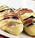 Quando estiverem quase prontas, retire-as do forno e coloque as azeitonas e o tomate seco entre as fatias, alternando as cores.