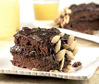 Massa: bata as gemas, a manteiga (reserve 1 colher de sopa) e o açúcar na batedeira por 5 minutos. Derreta o chocolate em banho-maria e despeje na massa, alternadamente, com o leite, a farinha e o fermento peneirados. Bata por mais 10 minutos. Bata as claras em neve por 3 minutos na batedeira, ou até obter picos firmes, e incorpore à massa delicadamente. Unte com a manteiga reservada uma fôrma para bolo quadrada de 19 cm e despeje a massa. Leve para assar em forno médio (180°C), preaquecido, por 45 minutos, ou até que enfiando um palito, ele saia limpo. Recheio: coloque em uma panela o creme de leite e a manteiga e leve ao fogo alto por 3 minutos, ou até ferver. Retire, junte o chocolate e a essência de amêndoas e misture bem até o chocolate derreter. Leve à geladeira por 2 horas. Montagem: desenforme o bolo e retire a superfície e as laterais. Parta-o ao meio e coloque parte do recheio. Cubra-o com o restante da massa e do recheio e decore a lateral com as amêndoas. Sirva o bolo gelado.