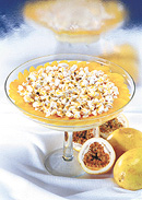 Junte o creme de leite e torne a misturar. Coloque numa travessa ou compoteira baixa a metade do creme, espalhe por cima os pêssegos cortados e regue com o suco de maracujá.