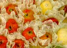 Leve ao fogo o leite condensado e a manteiga, mexendo sempre, até que a massa comece a soltar do fundo da panela. Despeje sobre um prato molhado e deixe esfriar. Prepare as frutinhas no formato desejado (maçã, pêra, melância, laranja), de preferência com um dia de antecedência, para que sequem bem. Misture o corante (na cor desejada) com a gema, o que permitirá uma melhor utilização. Faça uma calda com o açúcar, a água e o karo até que comece a pegar cor. Acrescente o suco de limão (o que impedirá que a calda açucare). Logo que começar a dourar, caramelize os doces.