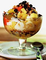 Em uma tigela, coloque todas as frutas e regue com o suco de laranja. Em uma taça de sobremesa, coloque o mel, metade do iogurte, das uvas passas e da castanha. Acrescente as frutas e distribua o iogurte, as uvas passas e a castanha restantes. Regue com o mel e sirva.