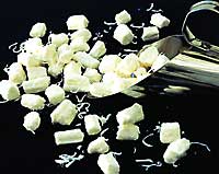 Retire do fogo e despeje sobre uma superfície untada com manteiga. Deixe esfriar e “puxe” a massa até que fique perolada. Corte imediatamente com uma tesoura em tamanhos uniformes. Em seguida, salpique as balas com o coco ralado.