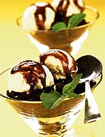 Em cada taça coloque uma bola de sorvete e regue com a calda quente de chocolate. Decore com as folhas de hortelã. Se preferir, decore com cerejas em conserva.