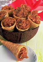 Massa: em uma tigela, coloque 1 xícara (chá) de água morna, a gordura vegetal, a gema, o aguardente e o sal e mexa bem. Junte a farinha de trigo, aos poucos, misturando a cada adição. Amasse por 8 minutos, ou até obter uma massa lisa. Cubra a tigela e deixe descansar por 15 minutos. Em uma superfície enfarinhada, abra a massa com 0,5 cm de espessura e corte tiras de 1 cm. Enrole as tiras em canudos de metal sobrepondo a massa. Deixe um pouco da borda livre para facilitar a retirada da massa.
