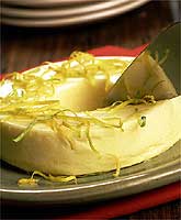 Retire do fogo, resfrie rapidamente a panela, abra e deixe o pudim esfriar. Em seguida, desenforme o pudim e decore com raspas de limão.