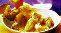 Lave as frutas, descasque-as e corte em pedaços. Coloque-as em uma tigela, junte o açafrão, a páprica, o mel aquecido e o gengibre. Deixe macerar por 40 minutos.