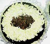Coloque a mistura em uma fôrma e, depois de frio, leve à geladeira. Retire a musse da geladeira e espalhe o granulado nas laterais da torta, as raspas de chocolate branco por cima e as raspas de chocolate preto no centro.