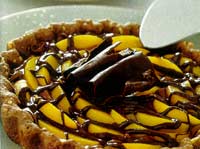 Massa: peneire em uma tigela a farinha e o cacau, junte as amêndoas, o sal, 6 colheres (sopa) de açúcar e a manteiga em pedaços pequenos. Misture com as pontas dos dedos até obter uma massa quebradiça. Junte o ovo e o vermute e misture rapidamente. Forme com a massa uma bola, envolva-a em filme plástico e deixe descansar na geladeira por 30 minutos. Ligue o forno à temperatura média. Abra a massa a uma espessura de cerca de 0,5 cm. Unte com a manteiga e enfarinhe uma fôrma redonda de aro removível de cerca de 24 cm de diâmetro. Forre a fôrma com a massa, cubra com uma folha de papel-manteiga untada e com uma camada de feijão cru. Leve ao forno médio por cerca de 30 minutos. Retire do forno, deixe esfriar e desenforme. Recheio: afervente os pêssegos, retire a pele e corte-os em fatias. Coloque para ferver 600 ml de água com o açúcar restante por cerca de 10 minutos. Junte o pêssego, desligue o forno e deixe esfriar. Coloque o creme de chocolate com nozes em um refratário e derreta em banho-maria com metade do creme de leite. Incorpore 2 colheres (sopa) da calda de cozimento dos pêssegos e despeje essa mistura sobre a massa fria. Distribua por cima as fatias de pêssego, bem escorridas. Pique o cholate, coloque-o em um refratário e derreta-o em banho-maria com o creme de leite restante e 2 colheres (sopa) de calda do pêssego. Deixe até que o chocolate grude levemente no fundo do refratário. Retire do fogo e despeje, em fio, sobre a crostata. Deixe esfriar e sirva.