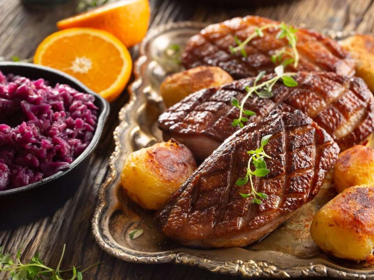 Peito de pato grelhado com batatas assadas e repolho roxo