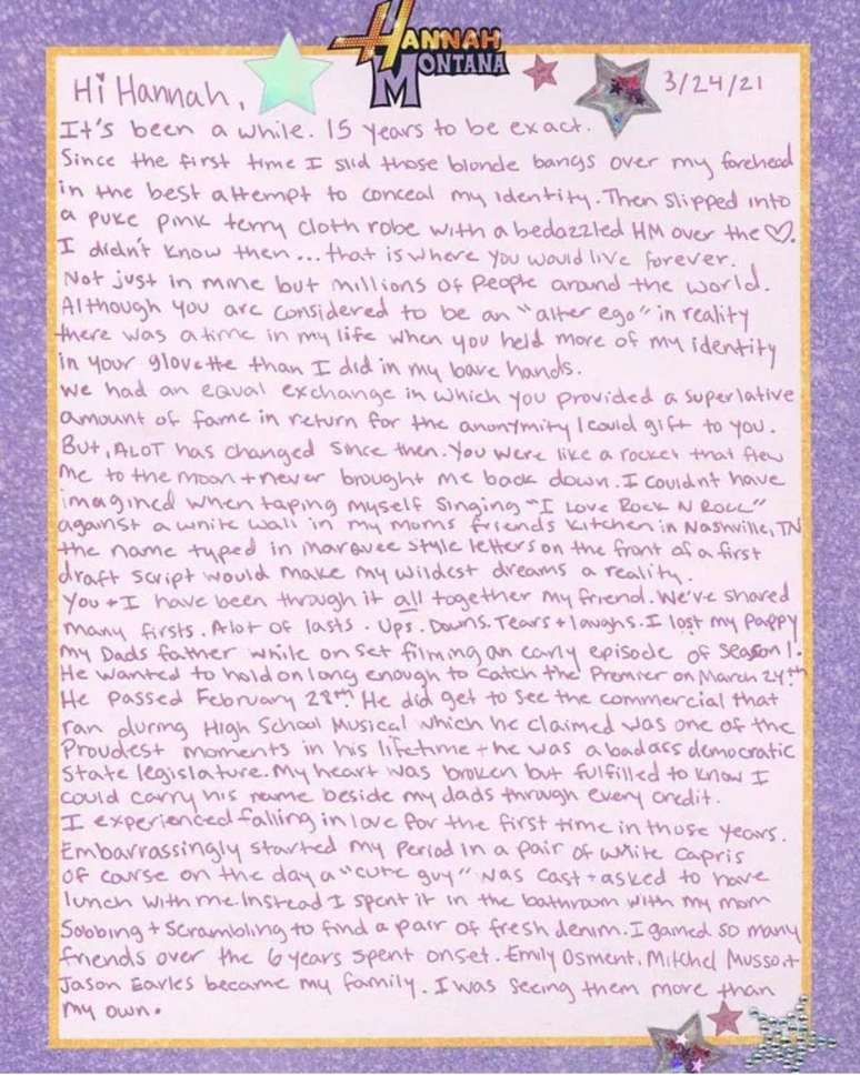 Carta aberta de Miley Cyrus à Hannah Montana na comemoração de 15 anos da série - Foto: reprodução/Instagram.