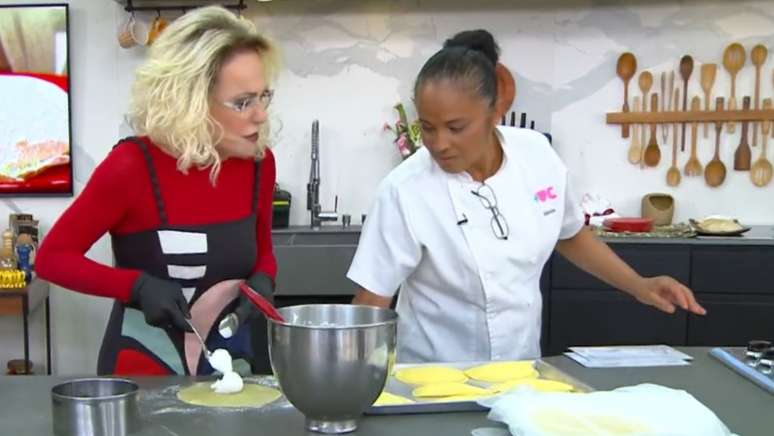 "Não, não tá na receita", explicou a global. "Ah tá", comentou Maria. "Tem que arrumar ali a receita, tá? Vai uma raspa de limão", reforçou Ana Maria, seguindo o preparado do doce que depois foi provado por Tati Machado e Alessandro Jodar.