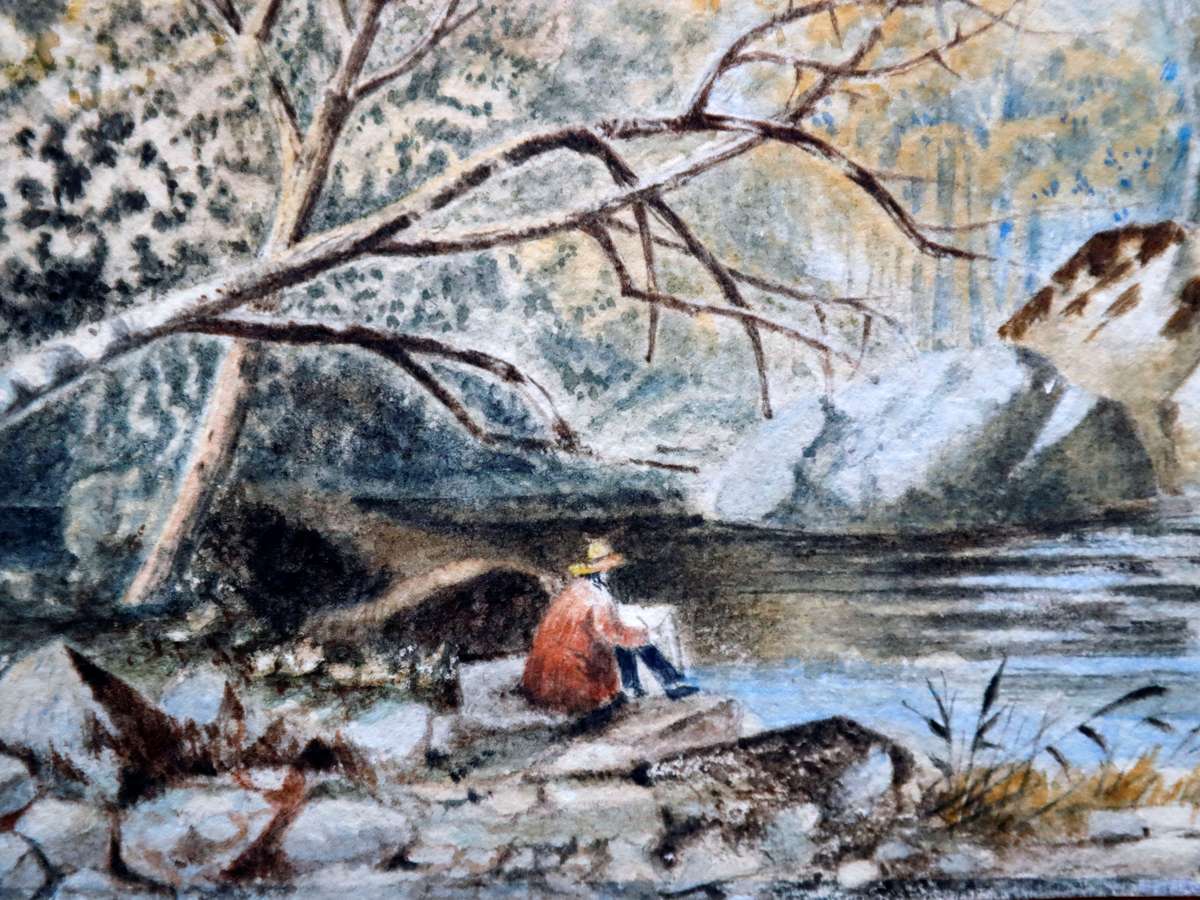 Três aquarelas retratam paisagem de montanha, um rio e uma figura distante sentada debaixo de uma árvore