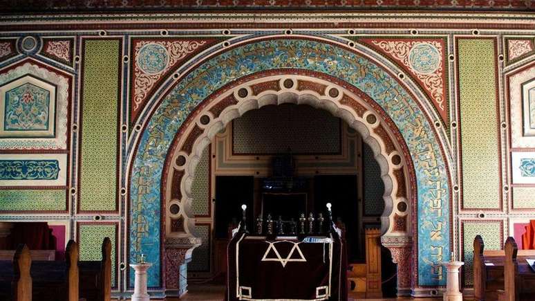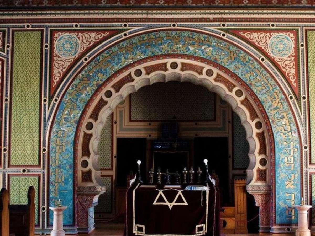 Quando entramos no segundo andar do prédio de pedra cor de salmão, com seus quatro domos em forma de cebola, a luz iluminou os vitrais com imagens da Estrela de Davi. Tomamos nossos lugares entre a congregação, enquanto o chazan (aquele encaregado na religião de recitar orações) David Kamhi ocupava o seu em frente à arca que continha a Torá (um pergaminho contendo os Cinco Livros de Moisés). Logo, a sinagoga se inundou com as harmonias de oração.