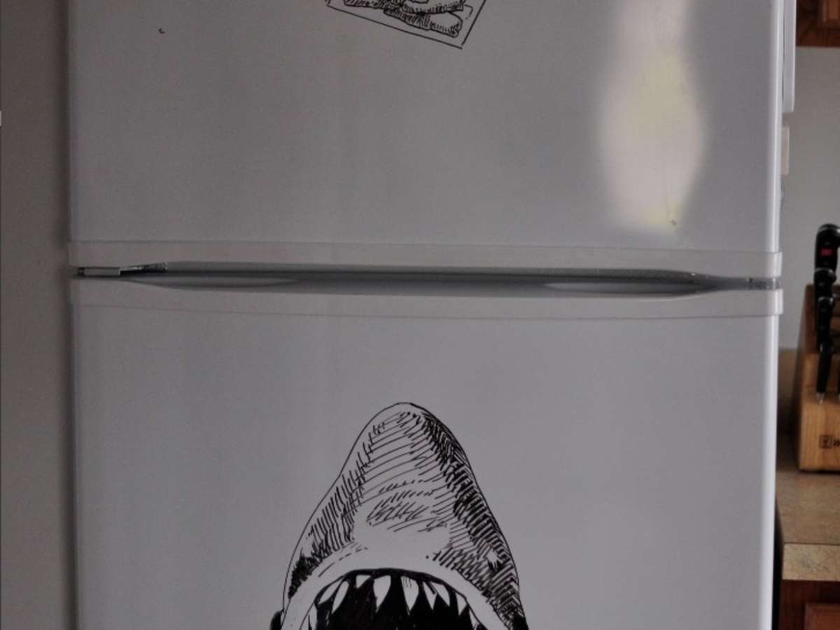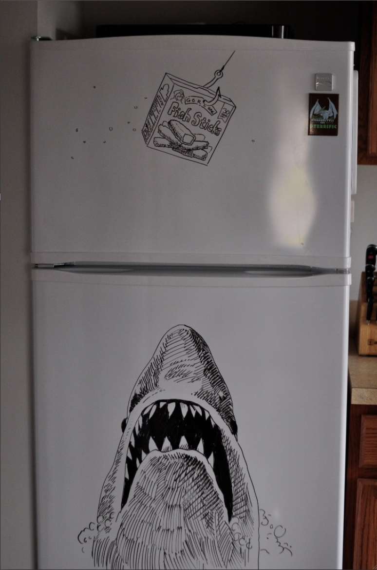 Usando as portas de sua geladeira comum para desenhar, o artista Charlie Layton percebeu que a superfície era muito parecida com as de lousas normais.