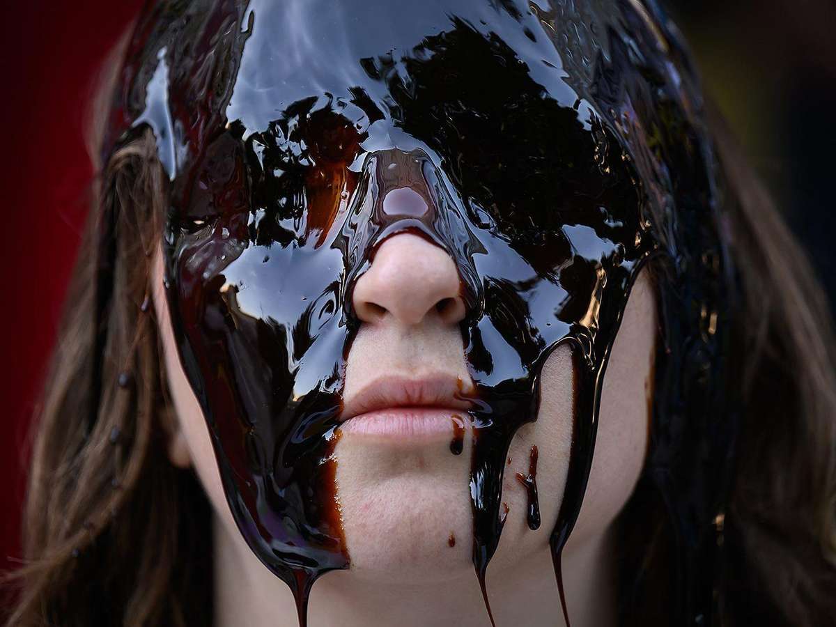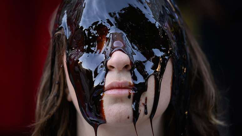Com o rosto coberto por uma substância oleosa, uma ativista do grupo de ação direta Fossil Free London posicionou-se na frente dos escritórios da empresa de energia Shell, em maio.