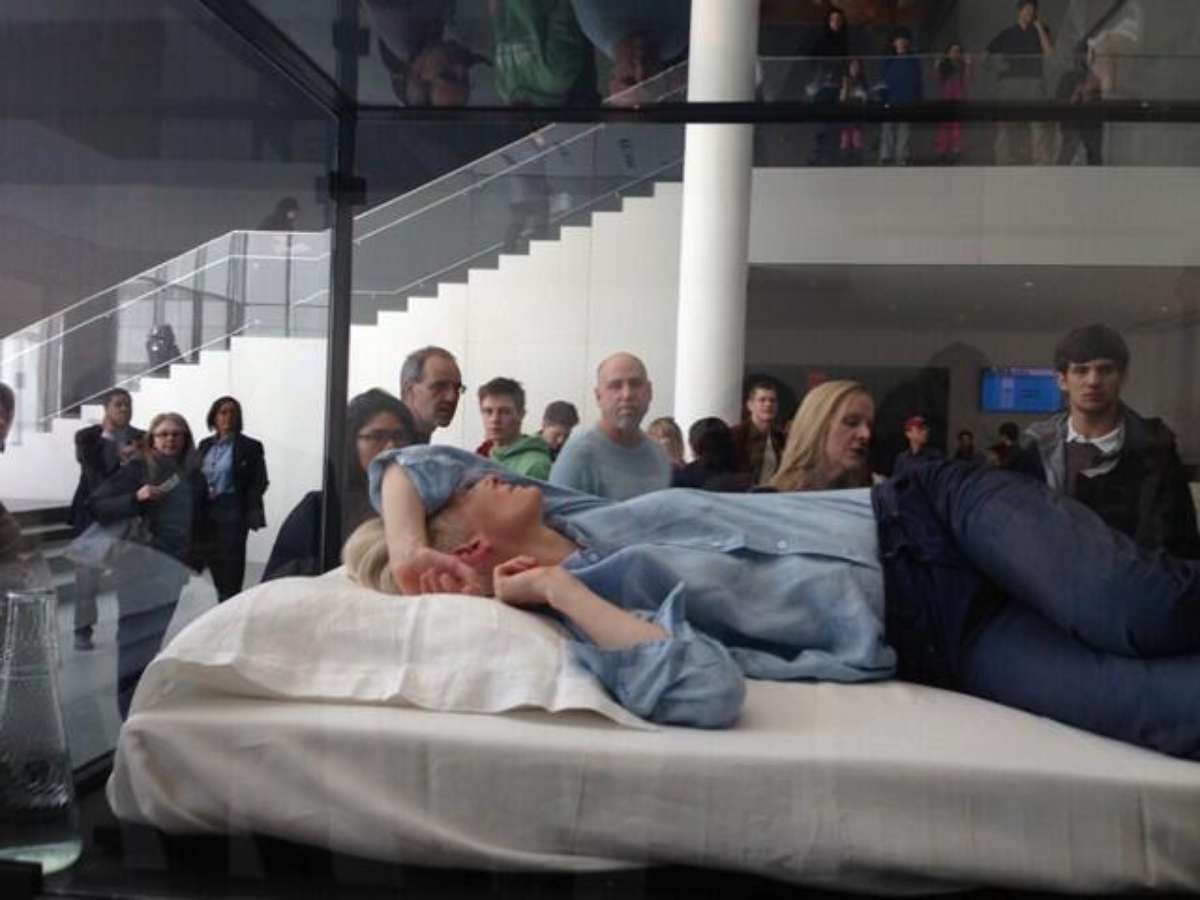 A atriz Tilda Swinton está, desde o último sábado (23), em exposição no MoMA, em Nova York, com a performance The Maybe, no qual dorme em uma caixa de vidro em um dos salões do museu.
