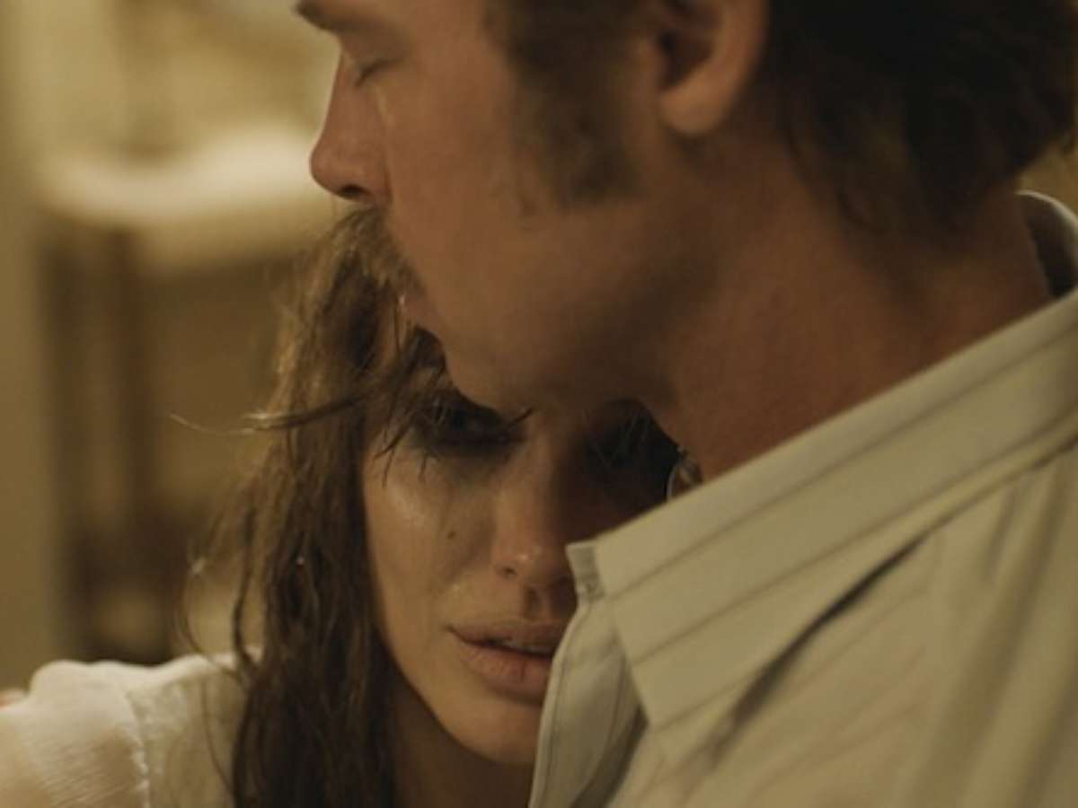Angelina Jolie chora nos braços de Pitt em foto de filme