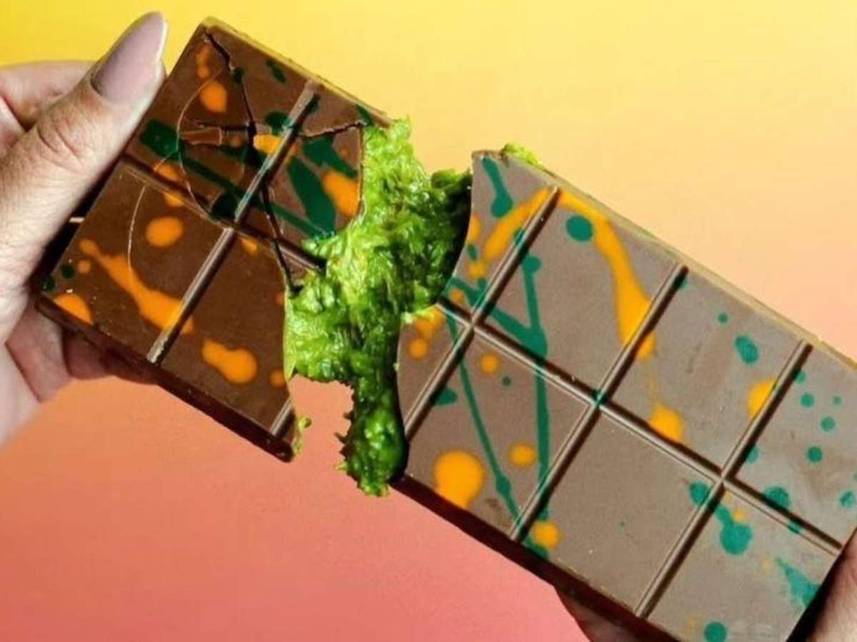 A aparência da barra parece feita sob medida para as redes sociais — desde as manchas atraentes em laranja e verde sobre o chocolate ao leite liso até o som crocante que ela faz ao ser quebrada.
