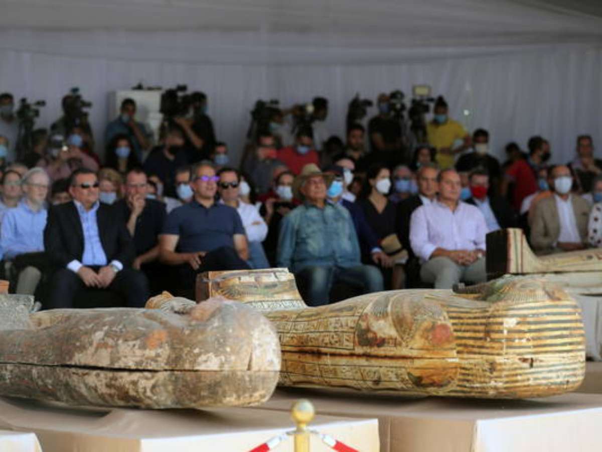 Uma cerimônia para apresentar 59 sarcófagos de 2,5 mil anos descobertos no sítio arqueológico de Saqqara, no Egito, viralizou nas redes sociais neste fim de semana por mostrar inúmeras pessoas ao redor das peças sem nenhum tipo de proteção.