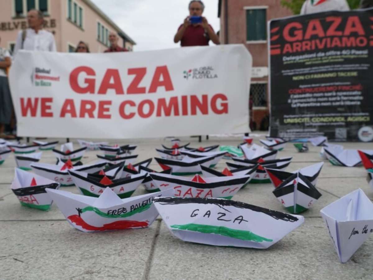 A concentração de participantes do movimento, organizado por centros sociais e pelo clube ANPI "7Martiri", teve início na Piazzale di Santa Maria Elisabetta. Centenas de barquinhos de papel pintados com a bandeira palestina foram colocados na calçada da praça.