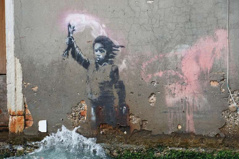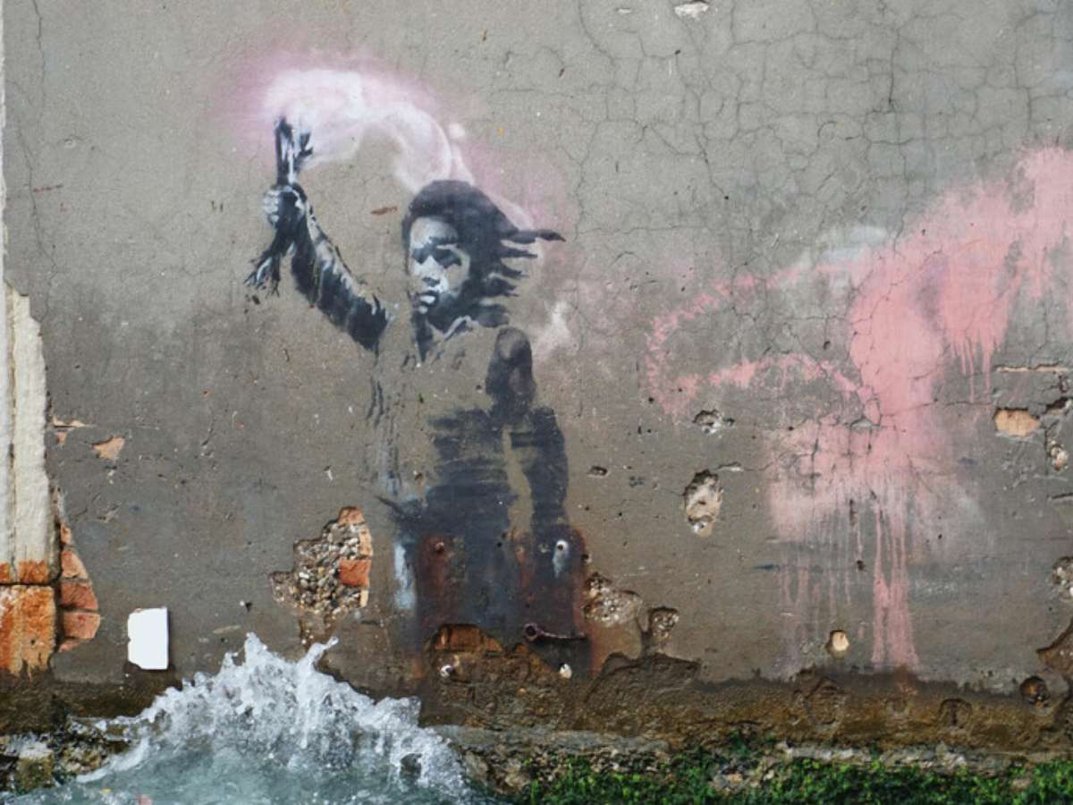A obra, que foi feita durante a Bienal de Veneza de 2019, retrata uma criança vestindo um colete salva-vidas segurando um sinalizador rosa. O local virou ponto turístico, mas a pintura se deteriorou em razão da água.