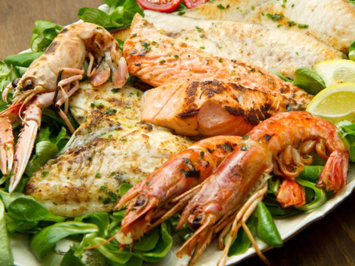 Já os mariscos cozinham em menos tempo (cerca de três minutos cada lado). Alguns minutos do lado da casca serão suficientes para os camarões/lagostins.