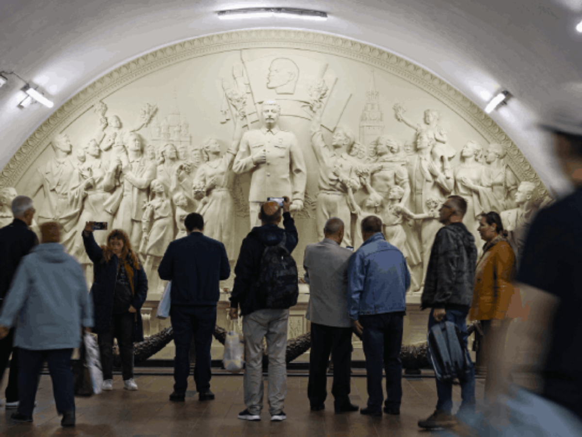 O monumento a Stalin, que retrata o ex-governante olhando para o horizonte, ladeado por trabalhadores em adoração e crianças oferecendo-lhe flores, foi instalado dentro da estação Taganskaya do metrô de Moscou.