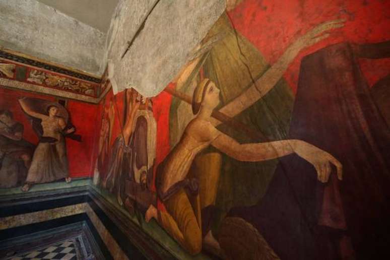 O complexo suburbano da Vila dos Mistérios, com uma vista panorâmica do mar, é conhecido por seus grandes afrescos em honra a Dionísio - nas imagens, o deus grego do vinho é retratado ao lado da esposa Arianna. A área ainda abrigava um local de produção da bebida, datado do século 2 a.C..