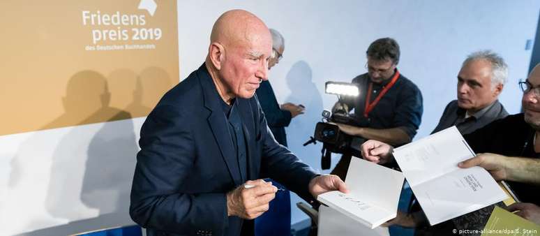 Agraciado com um dos prêmios literários mais importantes da Alemanha na Feira do Livro de Frankfurt, fotógrafo brasileiro afirma que homenagem tem significado especial num momento em que o Brasil vive "situação difícil".Em meio aos corredores e estandes coloridos da Feira do Livro de Frankfurt, destaque para as imagens em preto e branco de um brasileiro. Laureado com o Prêmio da Paz do Comércio Livreiro Alemão deste ano, uma das mais renomadas distinções literárias da Alemanha, o fotógrafo brasileiro Sebastião Salgado, 75 anos, falou a jornalistas durante o evento nesta sexta-feira (18/10), refletindo sobre seu trabalho e manifestando preocupação com a situação do Brasil sob o presidente Jair Bolsonaro.