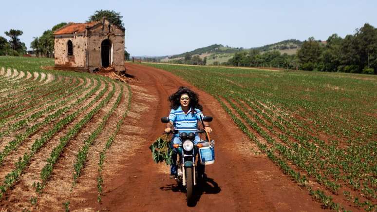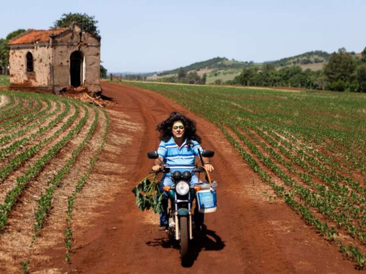 Um homem de meia-idade, maquiado ostensivamente e com uma peruca de cabelos pretos, longos e encaracolados, está de pé em cima de um trator, no meio de um campo. De braços erguidos, ele segura um pano vermelho, esvoaçante. Ele veste camiseta polo listrada e calça jeans. Barriga saliente.