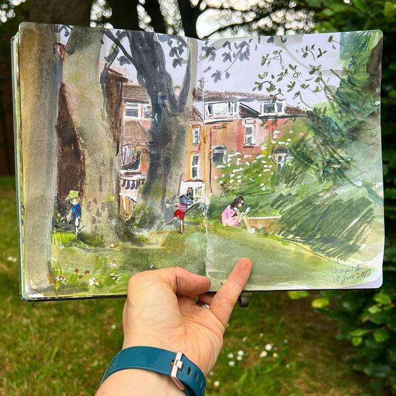 "Eu costumava desenhar muito meus filhos, mas agora eles são mais velhos e muito mais estáticos", relata a artista ao Estadão, que enfatiza a presença das telas, como o celular, na vida dos filhos. "Não acho tão interessante de desenhar."