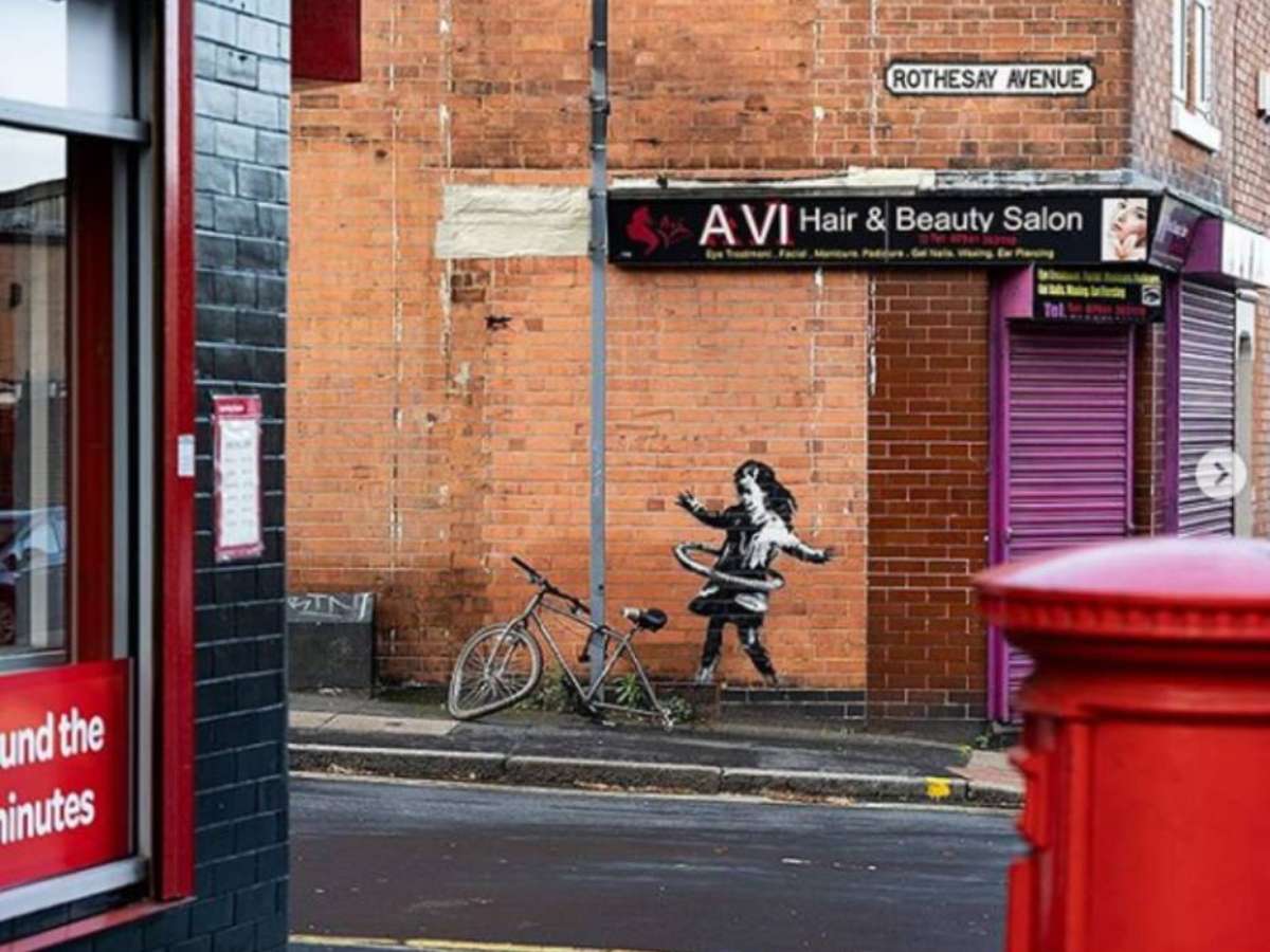 LONDRES, REINO UNIDO - O famoso artista britânico Banksy publicou neste sábado (17) nas redes sociais o grafite de uma menina brincando com um bambolê feito de pneu de bicicleta, que recentemente apareceu em uma parede de um salão de beleza de Nottingham.