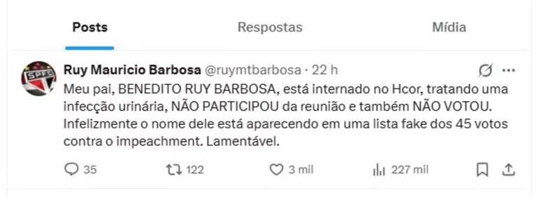 Para esclarecer que o pai não estava envolvido na votação e justificar sua ausência, Ruy Mauricio compartilhou a situação clínica do novelista em suas redes sociais.