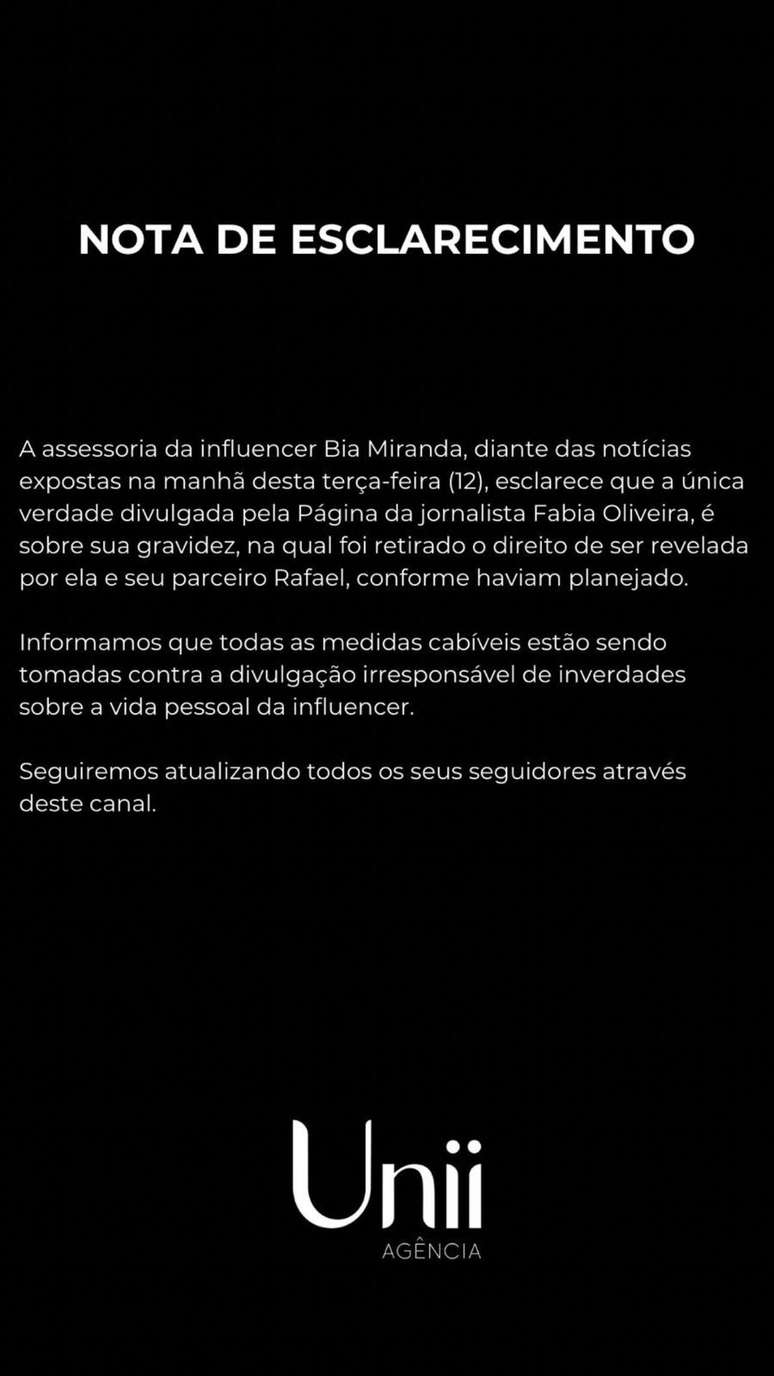 A equipe da influenciadora também se manifestou, por meio de nota oficial, afirmando que a única verdade divulgada nos prints supostamente trocados entre Bia e Gabriel é a gravidez da ex-peoa.