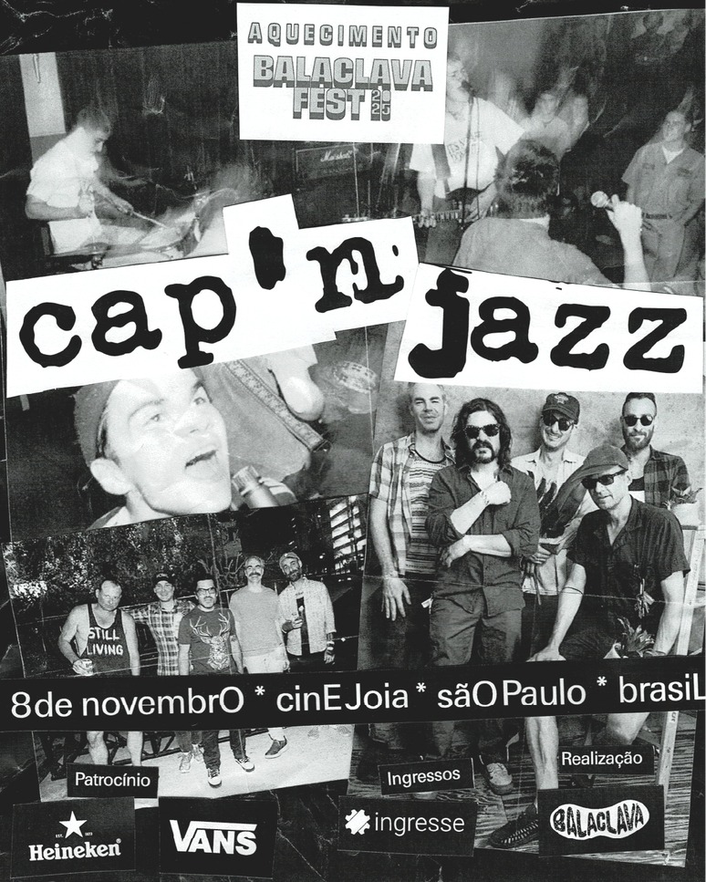 Em um feito que deve deixar fãs de emo, punk e indie nostálgicos em êxtase, a Balaclava Records traz ao Brasil, pela primeira vez, uma das bandas mais cultuadas da cena alternativa dos anos 90: o Cap'n Jazz. A apresentação acontece no dia 8 de novembro, sábado, no Cine Joia, em São Paulo, como parte da programação especial de aquecimento para a 15ª edição do Balaclava Fest. Os ingressos já estão disponíveis no site da Ingresse e também presencialmente, sem taxa de conveniência, no Takkø Café.