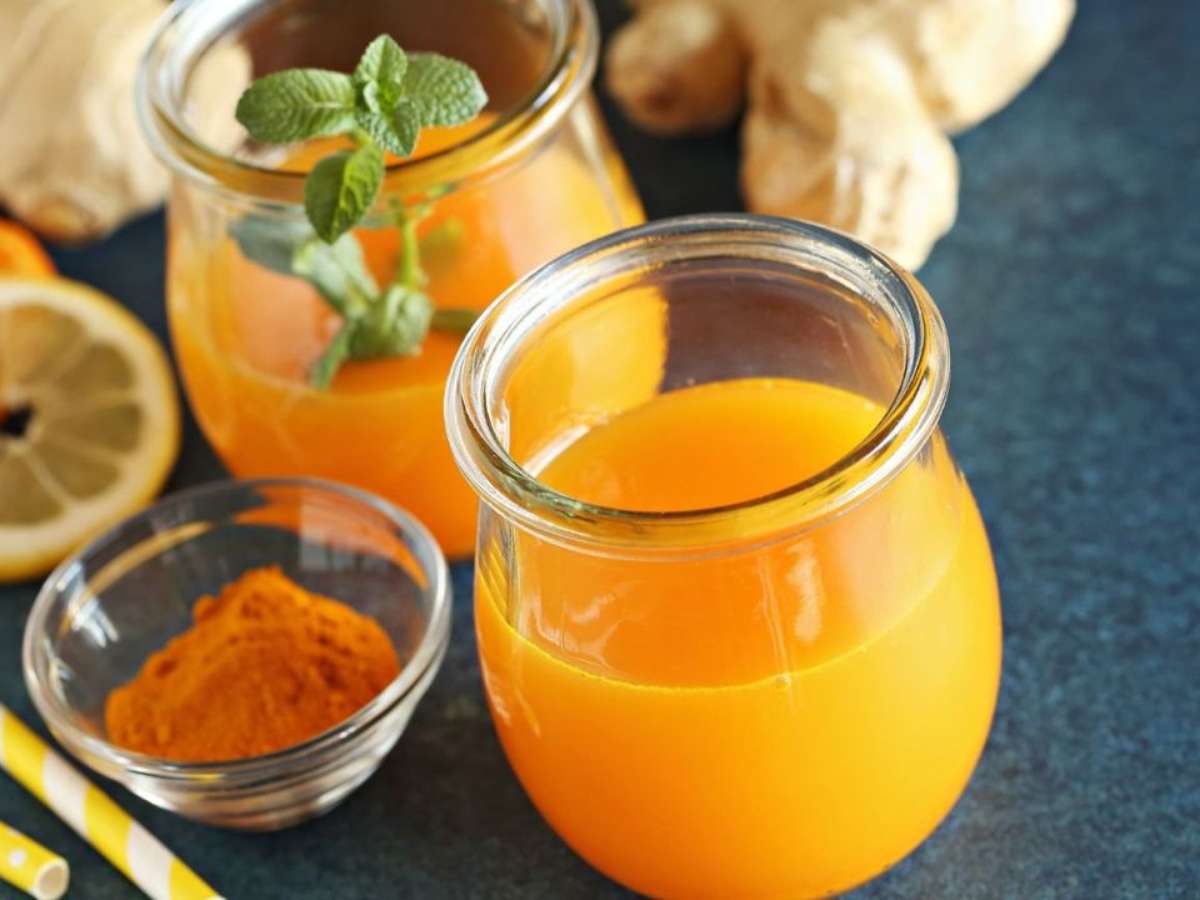 - Em um liquidificador, adicione o gengibre ralado, o açafrão em pó, o suco de limão, o mel, o vinagre de maçã e a pimenta caiena e pimenta preta e uma pitada de sal marinho.