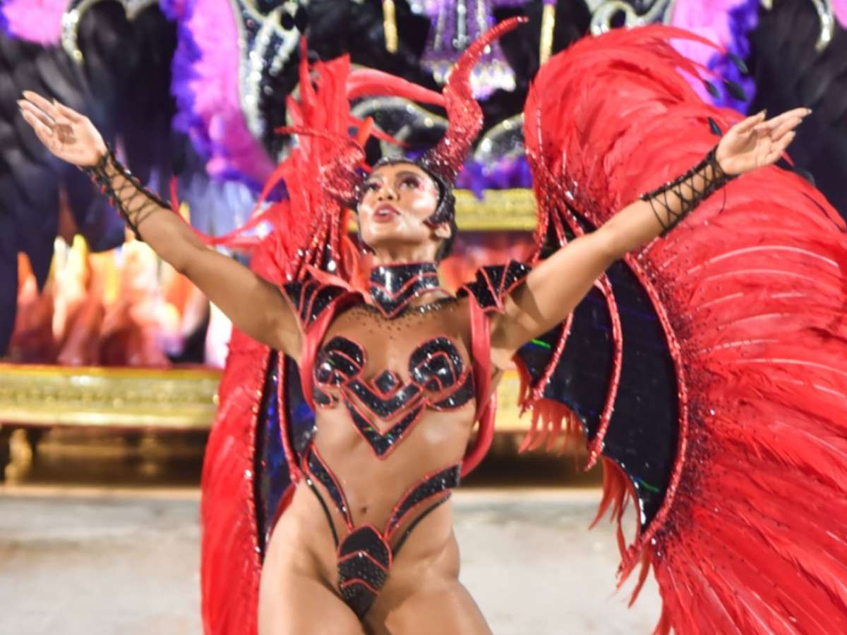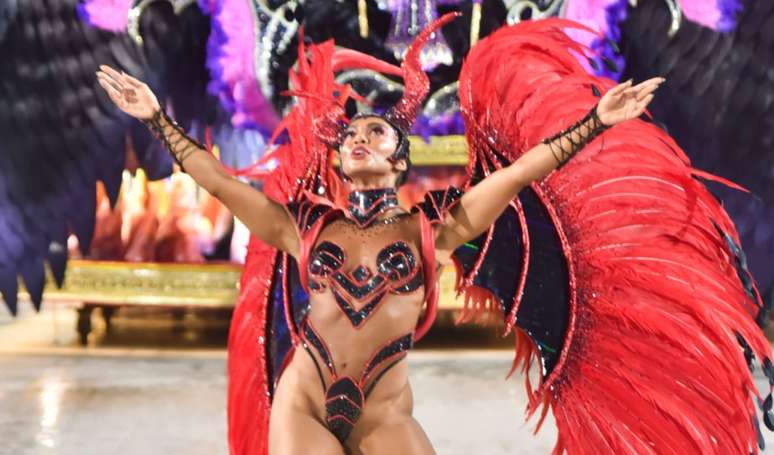Musa do Salgueiro no carnaval 2023, Dandara Mariana foi uma das famosas que brilhou na primeira noite de desfiles do Grupo Especial do Rio de Janeiro, neste domingo (19). Intérprete da Talita da novela "Travessia", a atriz representou Leviatã, um príncipe do inferno, no enredo "Delírios de Um Paraíso Vermelho" da escola do Andaraí, Zona Norte do Rio.