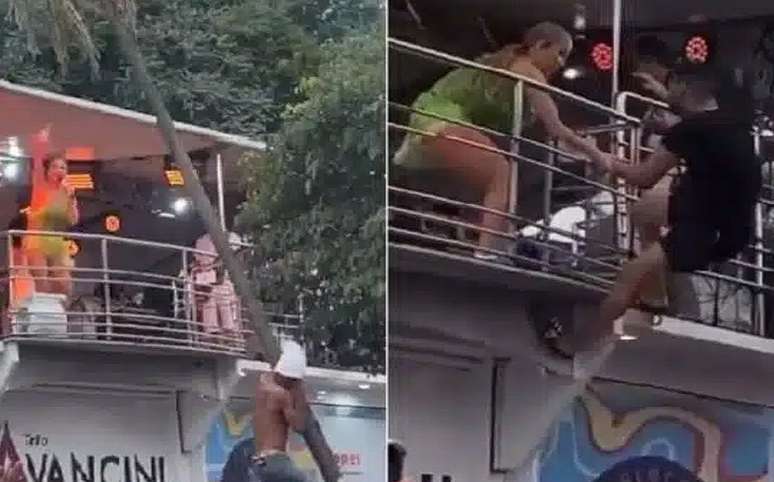 Imagens mostram o momento em que um folião aparece agarrado a uma palmeira, que desaba em meio ao público