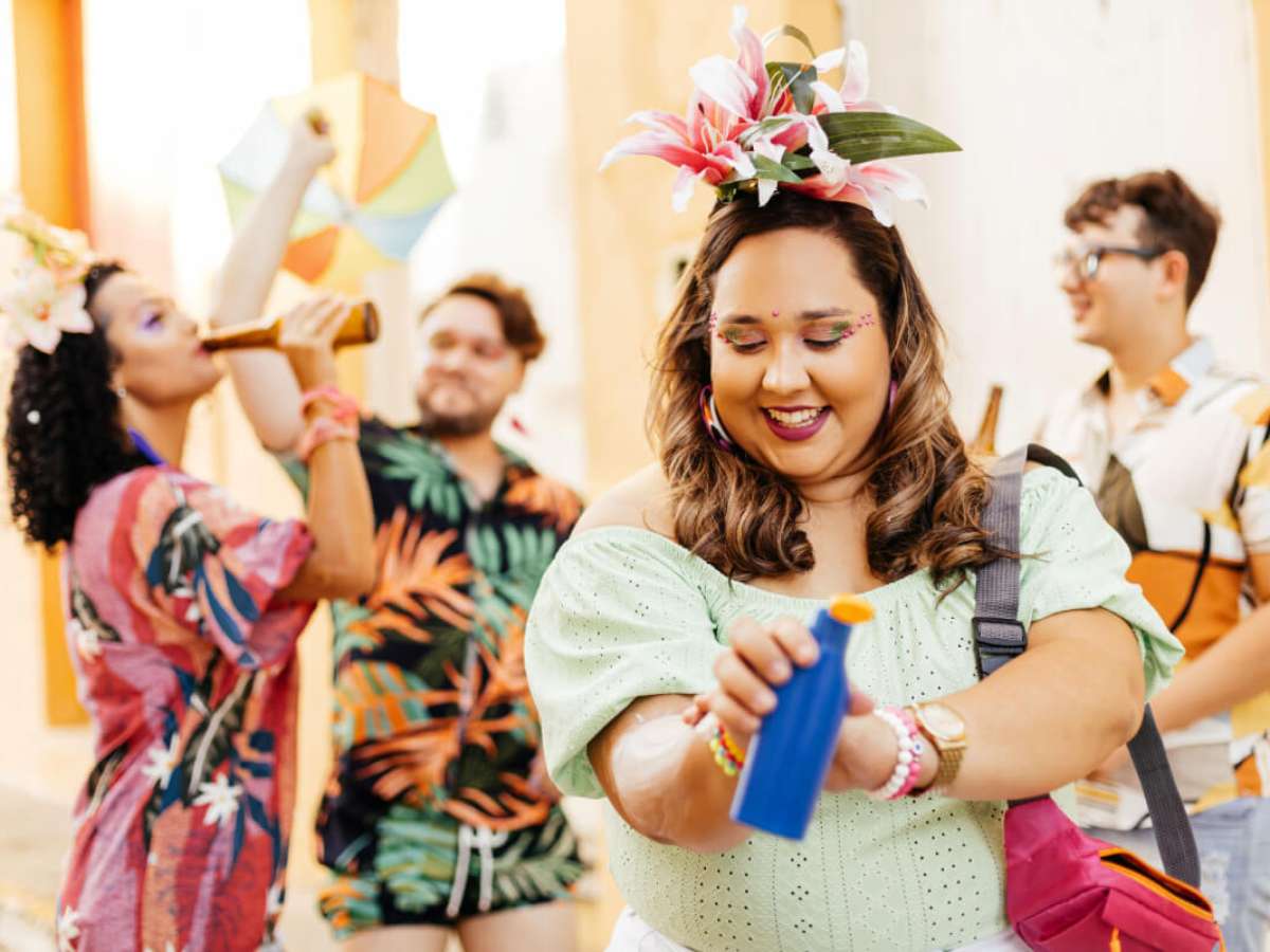 Os foliões podem se deparar com calor intenso durante o Carnaval. Por conta disso, o uso protetor solar se torna crucial, pois ele evita problemas como exposição aos raios UVA e UVB e previne manchas e câncer de pele. Além disso, o uso de chapéus e sombrinhas pode auxiliar na proteção contra o sol.