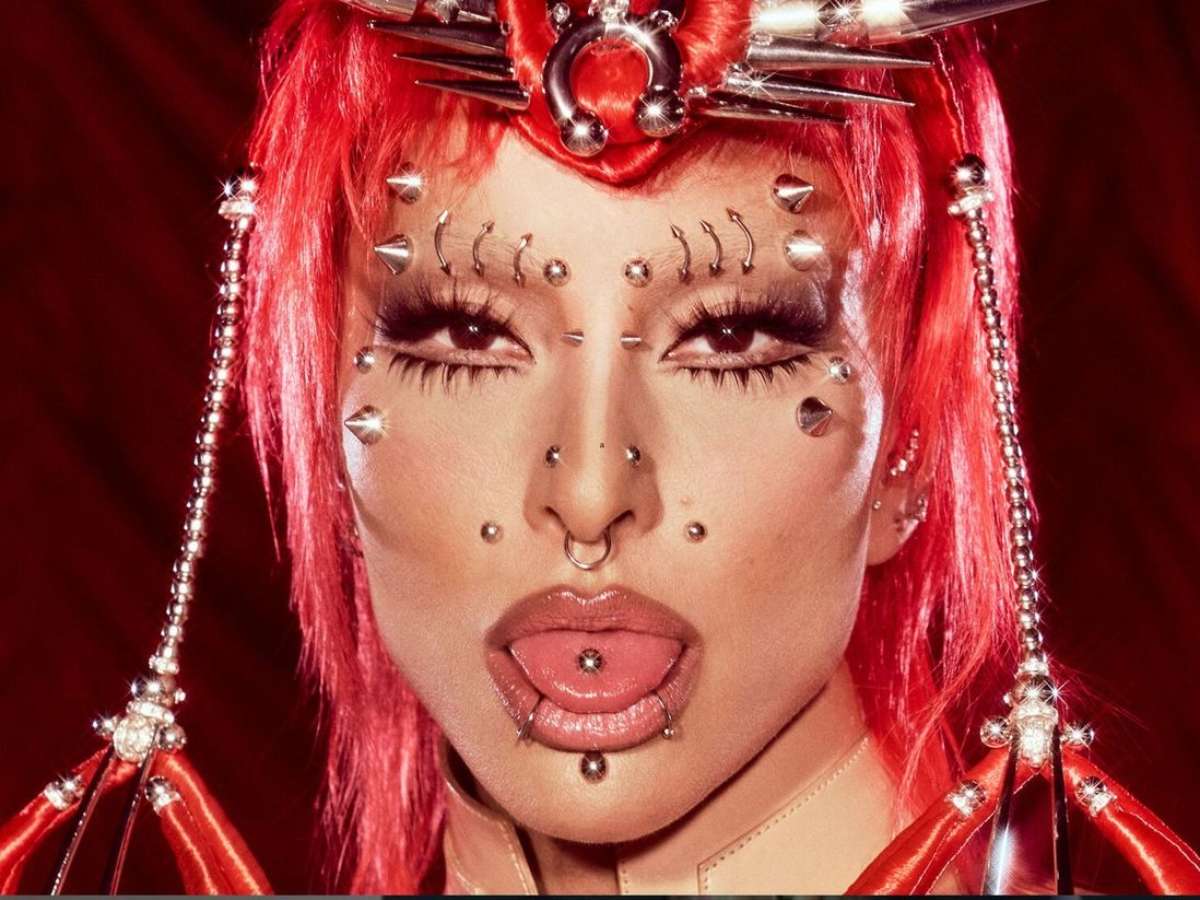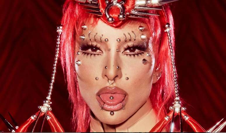 O figurino ainda contou com dezenas de piercings falsos espalhados pelo rosto, pedras aplicadas no nariz, sobrancelhas, testa e até no queixo. Na beleza, Sabrina apostou em cabelo vermelho vibrante e um adereço cromado no mesmo tom, reforçando a unidade do conceito.