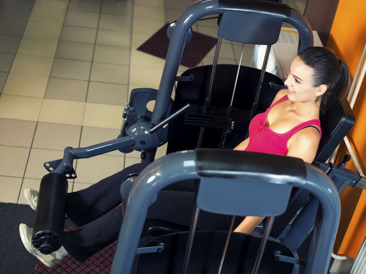 Cadeira extensora – atividade voltada para o quadríceps. “Durante o trabalho, é feita a extensão dos joelhos, por isso, é preciso ter cuidado para que essa região não fique em hiperextensão”, alerta a professora.