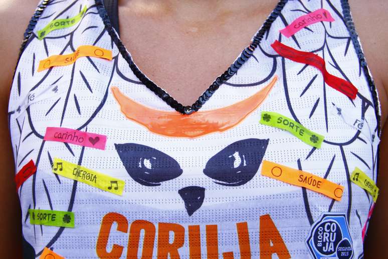 Em geral, as garotas recortam os abadás. Esta fez diferente: colou adesivos fofos sobre o busto.