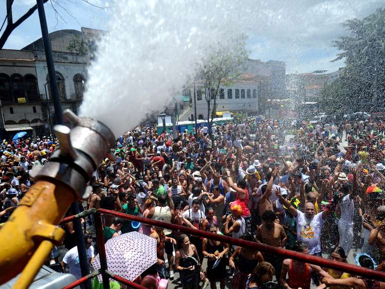 O forte calor no Rio de Janeiro neste domingo (3) desgastava muitos foliões, e só mesmo água para aliviar. A organização do bloco Escravos da Mauá levou essa receita a sério, e providenciou carros-pipa para refrescar as milhares de pessoas que seguiram o cortejo da agremiação, na manhã de hoje. Os jatos d`água fizeram sucesso, e animaram ainda mais o desfile do bloco pelas ruas da Zona Portuária do Rio de Janeiro.Foto: Mauro Pimentel / Terra