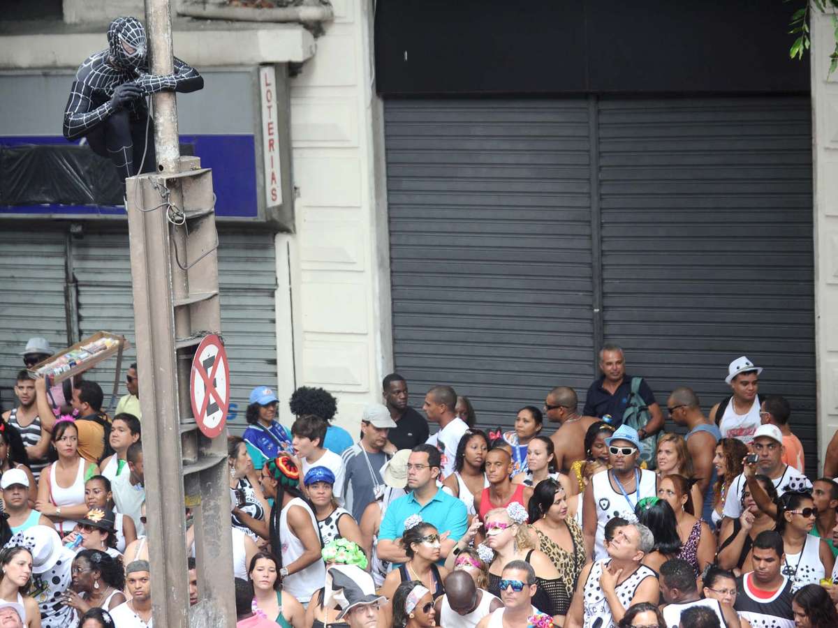 Rapazes vestidos de Homem Aranha subiram em uma banca de jornais e de postes de energia elétrica quando os trios elétricos do bloco chegavam perto da Rua da Assembleia, durante passagem do bloco Cordão da Bola Preta, no Rio. O bloco interrompeu o som para pedir que o grupo descesse de onde estava.
