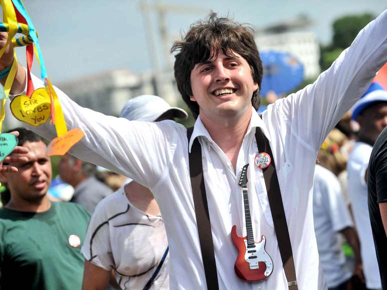 "Ano passado, tive que fugir dos seguranças. Mas eu mandei uma mensagem pelo Facebook e aí eles me autorizaram a ficar aqui do lado de dentro da corda", explicou, acenando para o seu outro parceiro, sósia de John Lennon. "Eu sou mais parecido, bem mais", brincou o estudante.